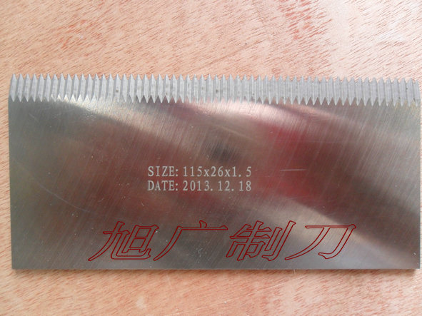 齿刀常用材质:SK-4、SK-5 、SK-2、SUS-440C 、420-J2 、SKD-11 、SKH9 、SKH2 、M35、M42等优质钢材。广泛用于包装机械,塑胶机械,食品机械等的制袋机刀片,封箱机刀片,切胶带刀片,旋转印刷机刀片,充填包装机刀片,计量包装机刀片,食品充填包装机刀片,外包装机刀片,化学工业机械刀片等各种锯齿刀片。