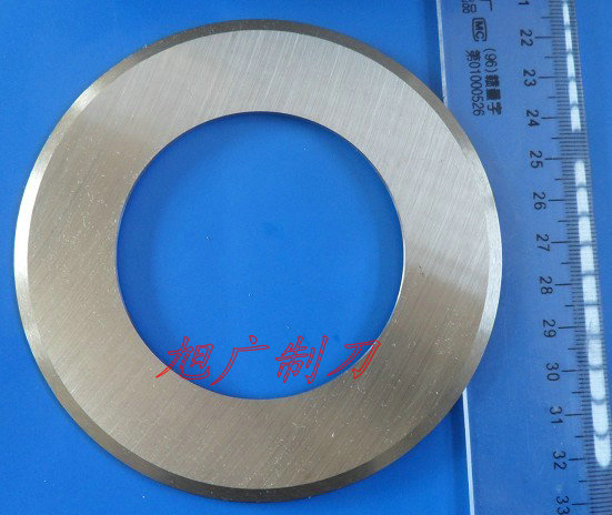 圆盘刀片即是圆形刀片,主要用于胶带、纸张、薄膜、金、银箔、铝箔、铜箔等物品的分切,要求刀片切断阻力最小,耐磨损性最大。选料:LD,SKD-11,SKH-51,9CrSi, Cr12Mov,W6Mo5CrV2,W18Cr4V等.